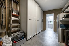 De praktische bijkeuken heeft een vaste kast, spoelbak en directe toegang naar tuin en garage. In de garage bevindt zich de verdeler van de vloerverwarming. Dit is een fijne ruimte voor het opbergen van spullen.