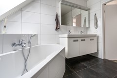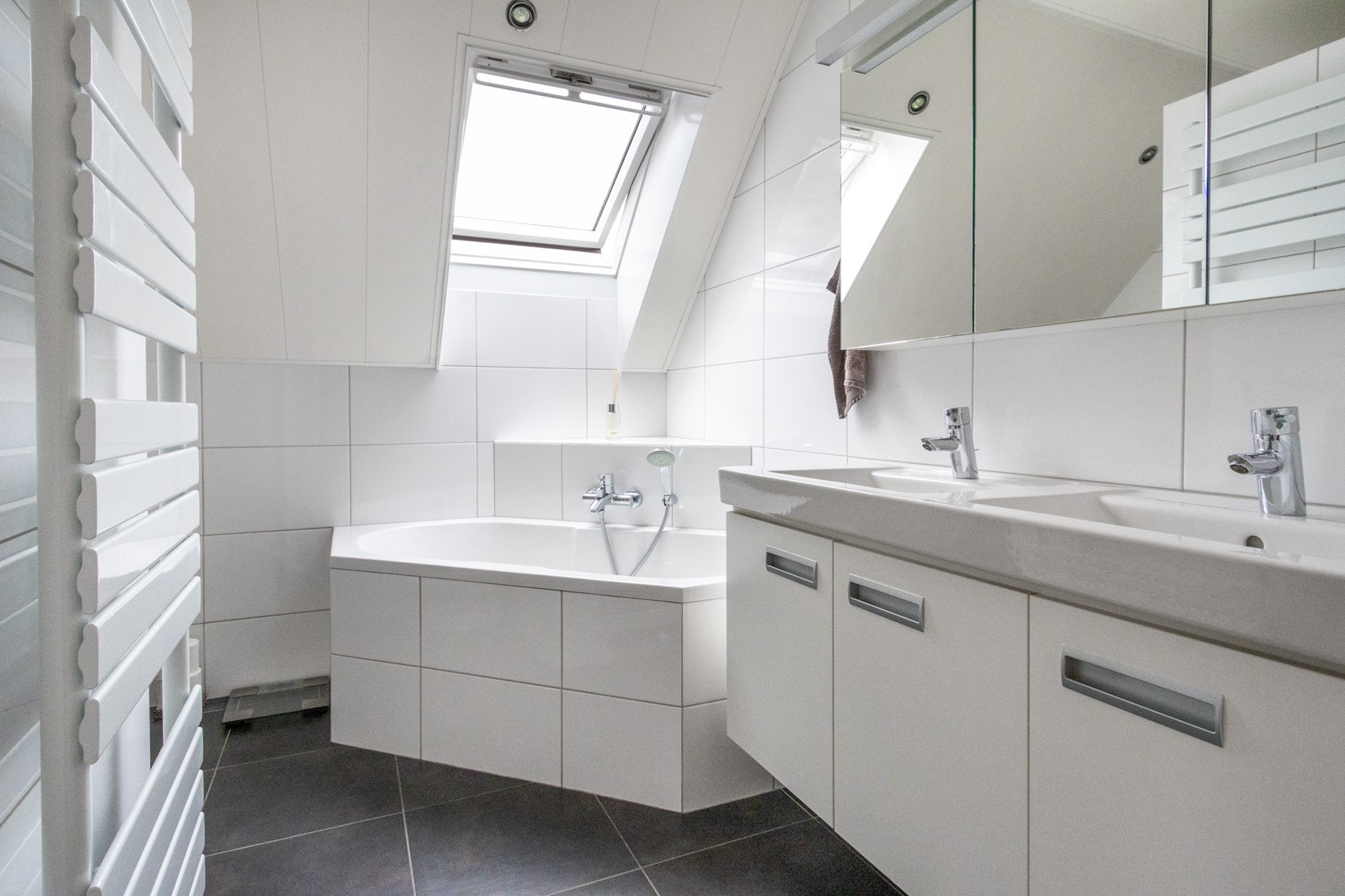 De badkamer is uitgevoerd met lichte wandtegels en antraciet vloertegels en beschikt over een dubbele wastafel met meubel, ligbad, inloopdouche en wandcloset.