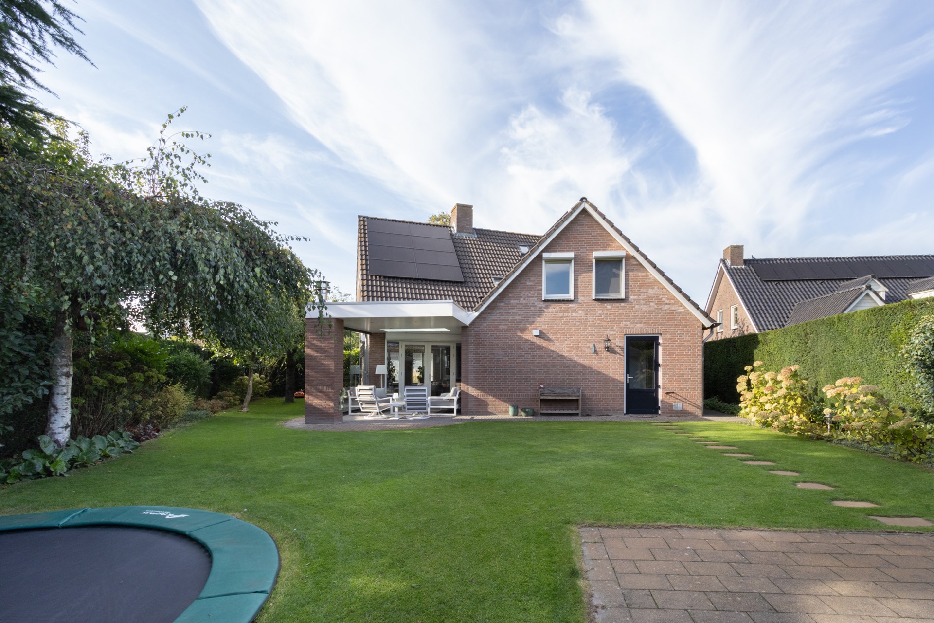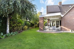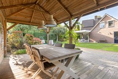 De tuin is prettig ruim en op het zuidoosten gelegen. Direct aan de woning is een sfeervolle overkapping geplaatst (2023) met geïntegreerde openhaard — een fijne plek om langer buiten te zitten.
