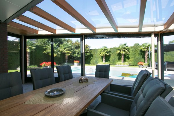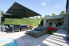 De fraai aangelegde mediterrane tuin met grote overkapping, jacuzzi en een prachtig buitenzwembad maken het plaatje compleet! Hier waan je je in je eigen privé resort en kun je op elk moment van het jaar genieten van het luxe buitenleven. Vanuit de keuken bereik je allereerst een lagergelegen terras met tv-aansluiting. Een fijne plek waar je lekker kunt relaxen en die binnen met buiten verbindt. Via een trap bereik je het hoger gelegen terras met glazen overkapping. Deze is deels te openen waardoor er op warme dagen verkoelende lucht door kan stromen. Hier staat ook de luxe jacuzzi die plaats biedt aan vier volwassenen. Het zwembad ligt centraal in de tuin en is rondom afwerkt met een natuurstenen terras. Dit alles wordt omgeven door gras, borders, palmbomen en groene hagen. Je privacy is hier 100% gegarandeerd!