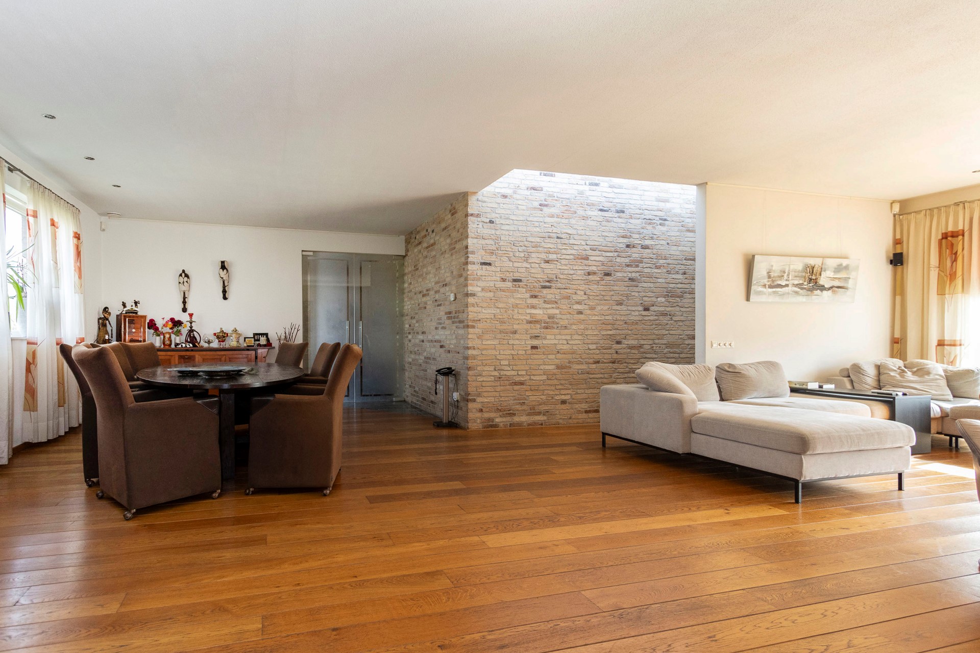 Het L-vormige woon- en eetgedeelte profiteert van een fijne lichtinval en veel ruimtelijkheid, onder andere door de prachtige stenen muur die hoog oploopt en waarlangs daglicht naar beneden vloeit. De woonkamer is verder ingericht met een stijlvolle gashaard en een mooie houten vloer die de ruimte een fijne warme sfeer geeft.