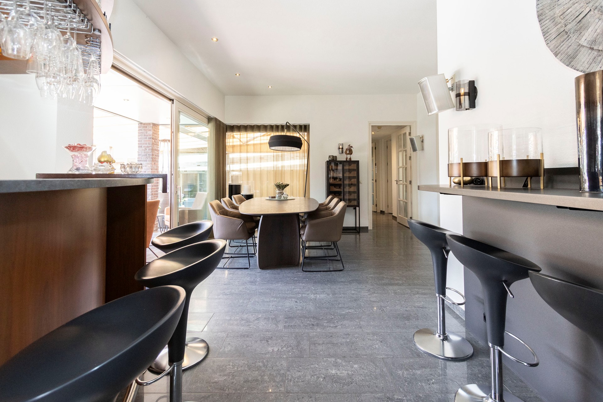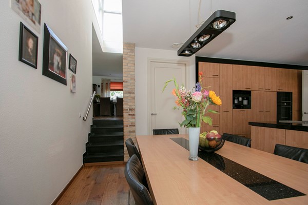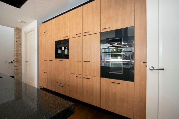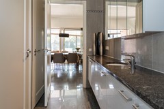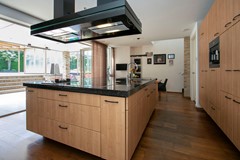 De riante leefkeuken vormt het hart van het huis. De keuken is uitgerust met een grote kastenwand en apart kookeiland, granieten werkblad, inductie kookplaat met aparte wokbrander op gas, twee ovens, vaatwasser en inbouw koffieautomaat. Er is een barretje waar je lekker aan kunt ontbijten of borrelen, maar ook meer dan genoeg ruimte om met het hele gezin uitgebreid te tafelen! Een grote glazen schuifpui geeft toegang tot de overkapte buitenruimte. Direct naast de keuken bevinden zich een grote bergruimte (dit is tevens de technische ruimte) en een aparte bijkeuken met witgoedaansluiting.