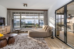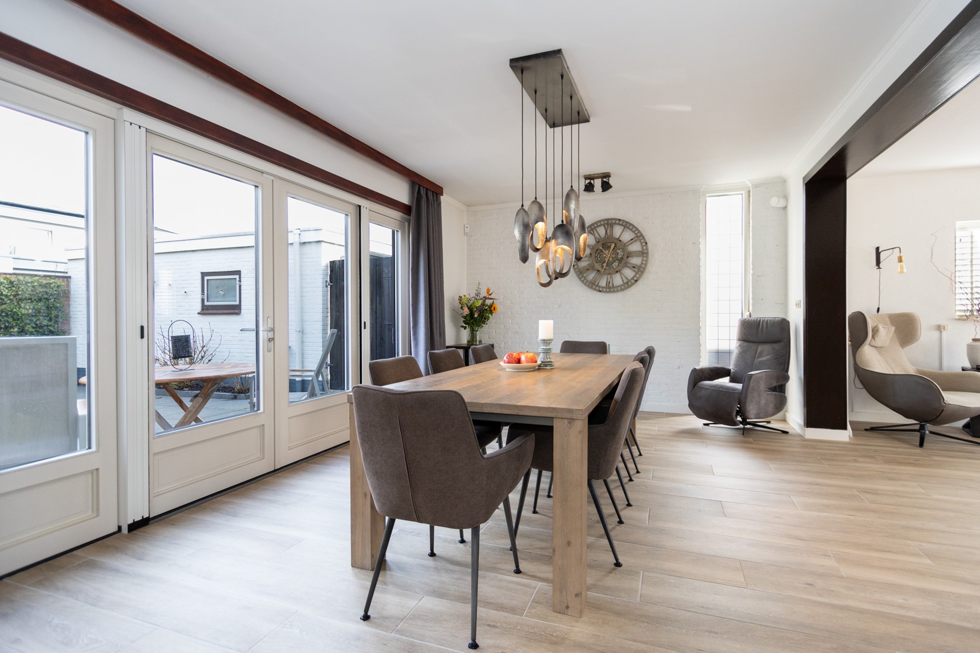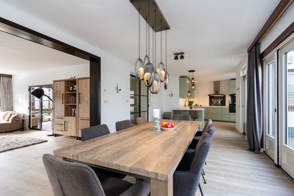 Naast een gezellige eetbar, is er ook een ruime eethoek naast de keuken gelegen. Hier valt veel licht binnen door de grote pui. Deze ruimte staat direct in verbinding met de woonkamer door de doorgang die later gerealiseerd is.
