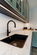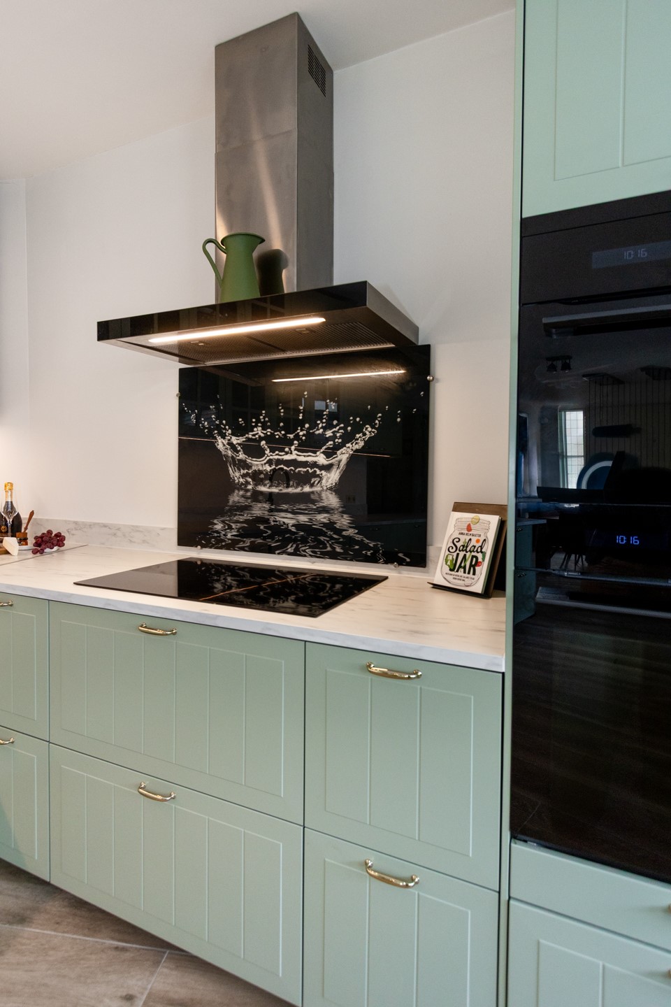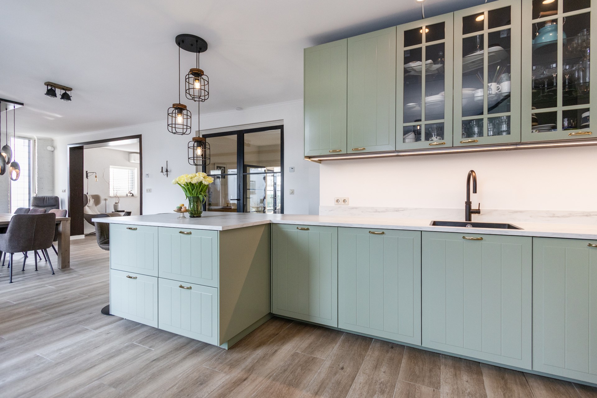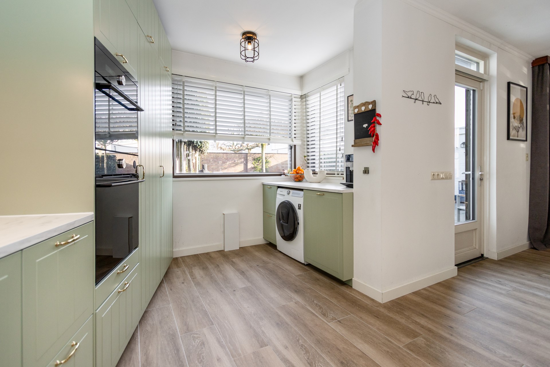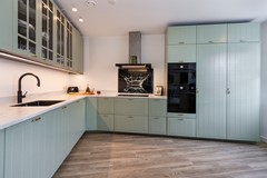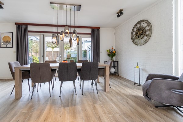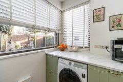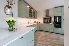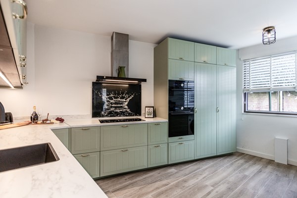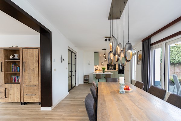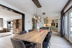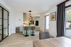 In de aanbouw bevindt zich de sfeervolle eetkamer, uitgevoerd met een brede houten pui en tuindeur voorzien van triple glas. Aansluitend ligt de idyllische keuken in landelijke stijl, voorzien van mintgroene kastjes en een marmerlook werkblad. De keuken is uitgerust met een inductiekookplaat, afzuigkap, vaatwasser, grote koelkast en vriezer, combi-oven, extra oven en Quooker-kraan. Ook is de wasmachine hier geplaatst en voorzien van dezelfde ombouw als de rest van de keuken.