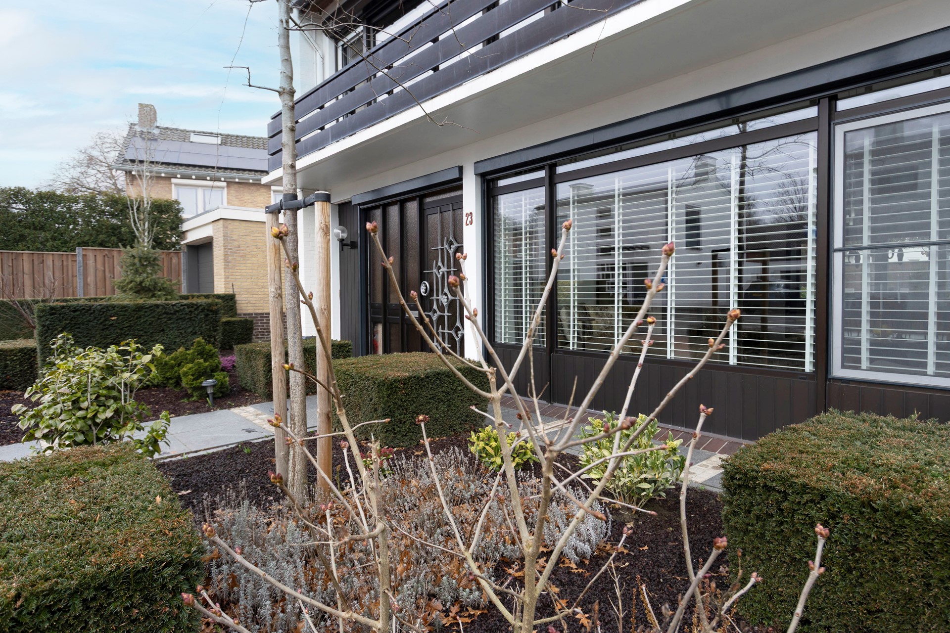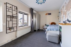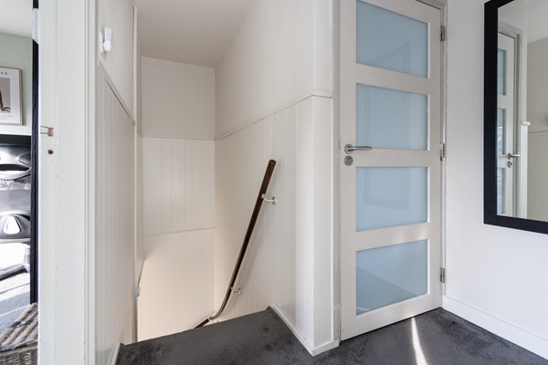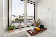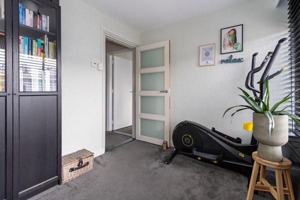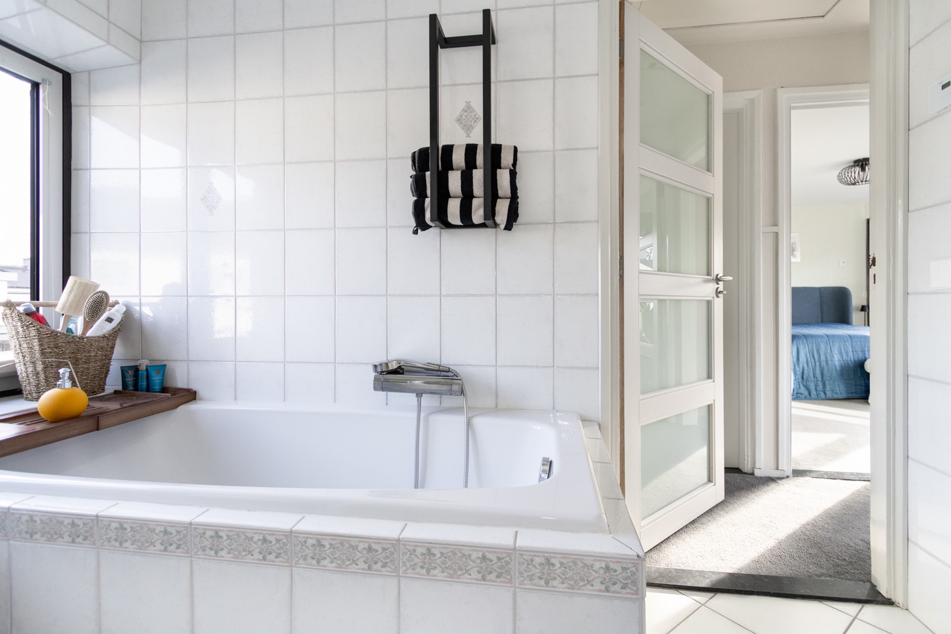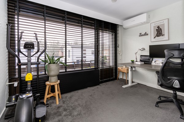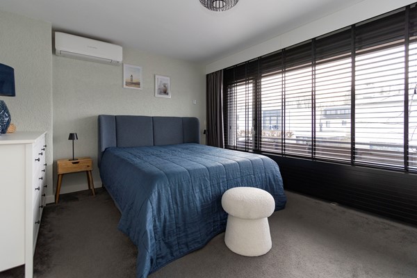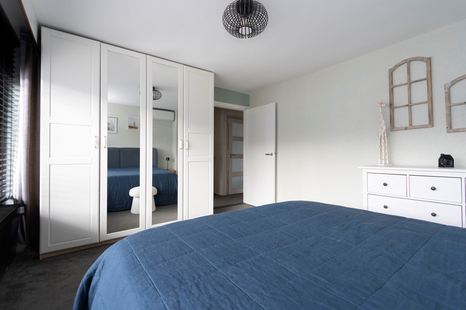 Op de eerste verdieping bevinden zich drie slaapkamers, alle voorzien van vloerbedekking, aluminium kozijnen met HR++ glas, airconditioning en rolluiken. De tweede badkamer is compleet uitgerust met een douche, brede wastafel met meubel en spiegelkast, ligbad en wandcloset. Via een vlizotrap bereik je de bergzolder, waarvan de vloer in 2023 geïsoleerd is. Een ruimte die zich uitstekend leent voor extra opslag.