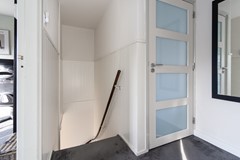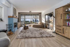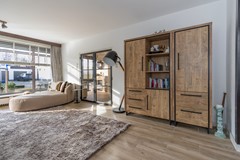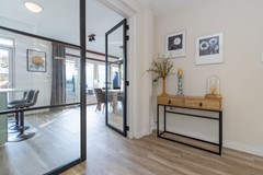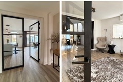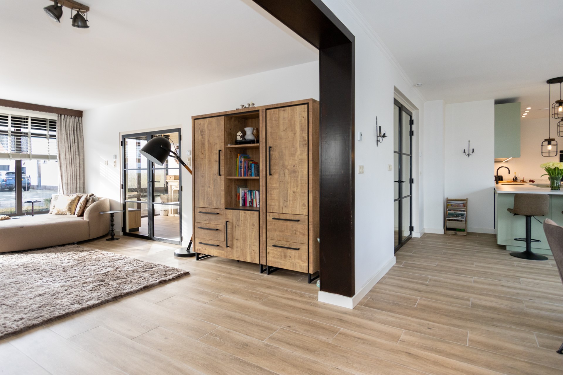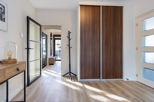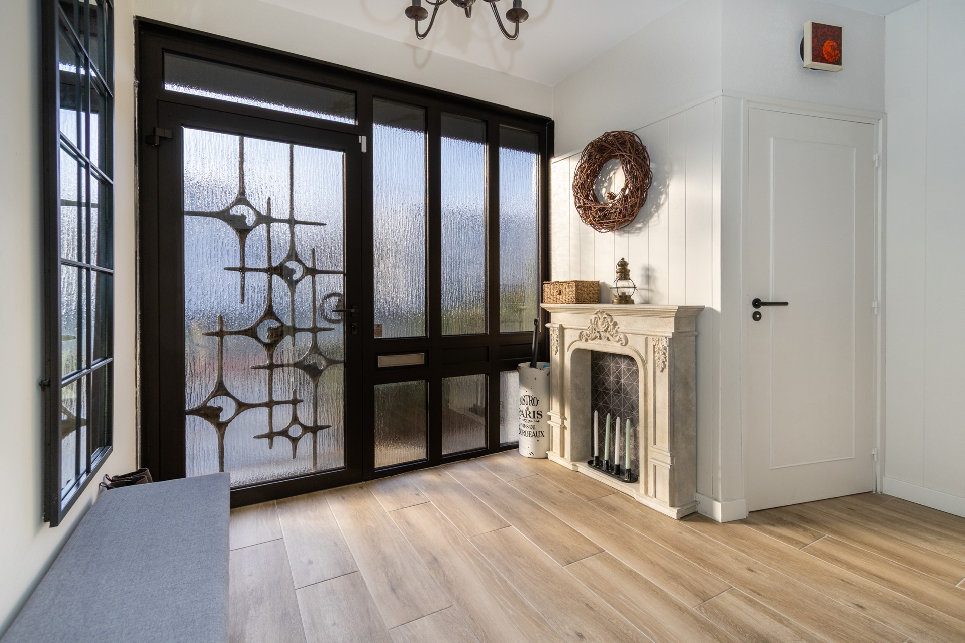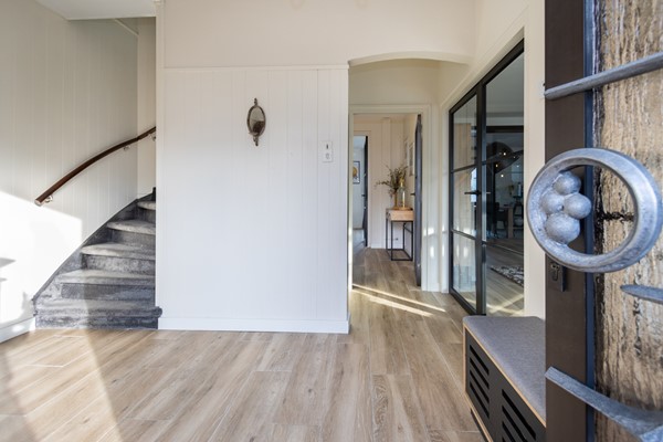 Je betreedt de woning via de entree aan de voorzijde. In de ruime ontvangsthal bevinden zich het toilet, de trapopgang en de toegang tot zowel de bijkeuken als de woonkamer. De woonkamer voelt direct warm en uitnodigend aan dankzij de doorlopende houtlook tegelvloer met vloerverwarming en de gezellige houthaard. De aluminium kozijnen met HR++ glas zorgen voor een prettig binnenklimaat en veel daglicht.