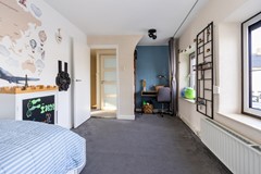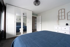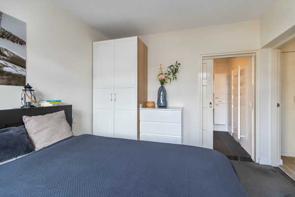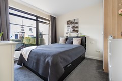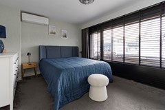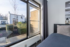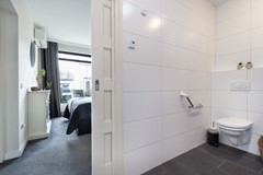 Via het tussenportaal bereik je de slaapkamer en badkamer op de begane grond. Ideaal voor gelijkvloers wonen of als gastenverblijf. Deze kamer beschikt over aluminium kozijnen met HR++ glas, airconditioning en een ruim opgezette en suite badkamer met inloopdouche, wandcloset, wastafel met meubel en spiegelkast, designradiator, vloerverwarming en mechanische ventilatie.