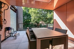 Het grote dakterras aan de achterzijde is uniek te noemen. Een deel is overdekt en hier kun je heerlijk droog en uit de wind vertoeven. Vanuit het terras kijk je op de binnenplaats van het complex. Het dakterras loopt door langs de lengte van het appartement.
