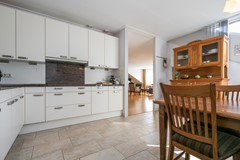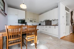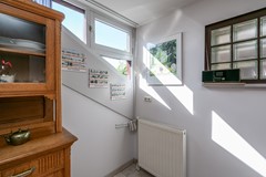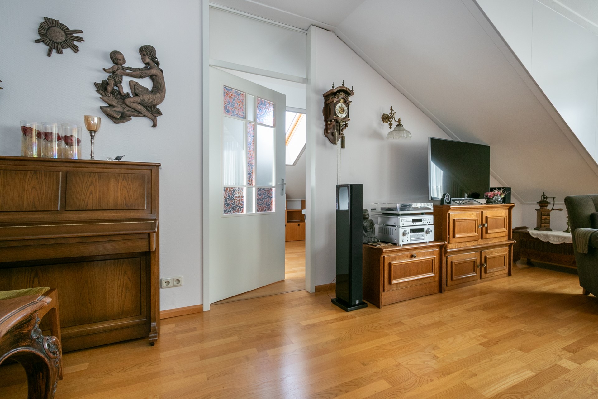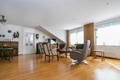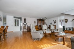 De ruime woonkamer heeft aan de voorzijde grote raampartijen die zorgen voor daglichttoetreding. Vanuit de woonkamer heb je toegang tot een extra kamer (thans in gebruik als hobbykamer) en de halfopen keuken.
