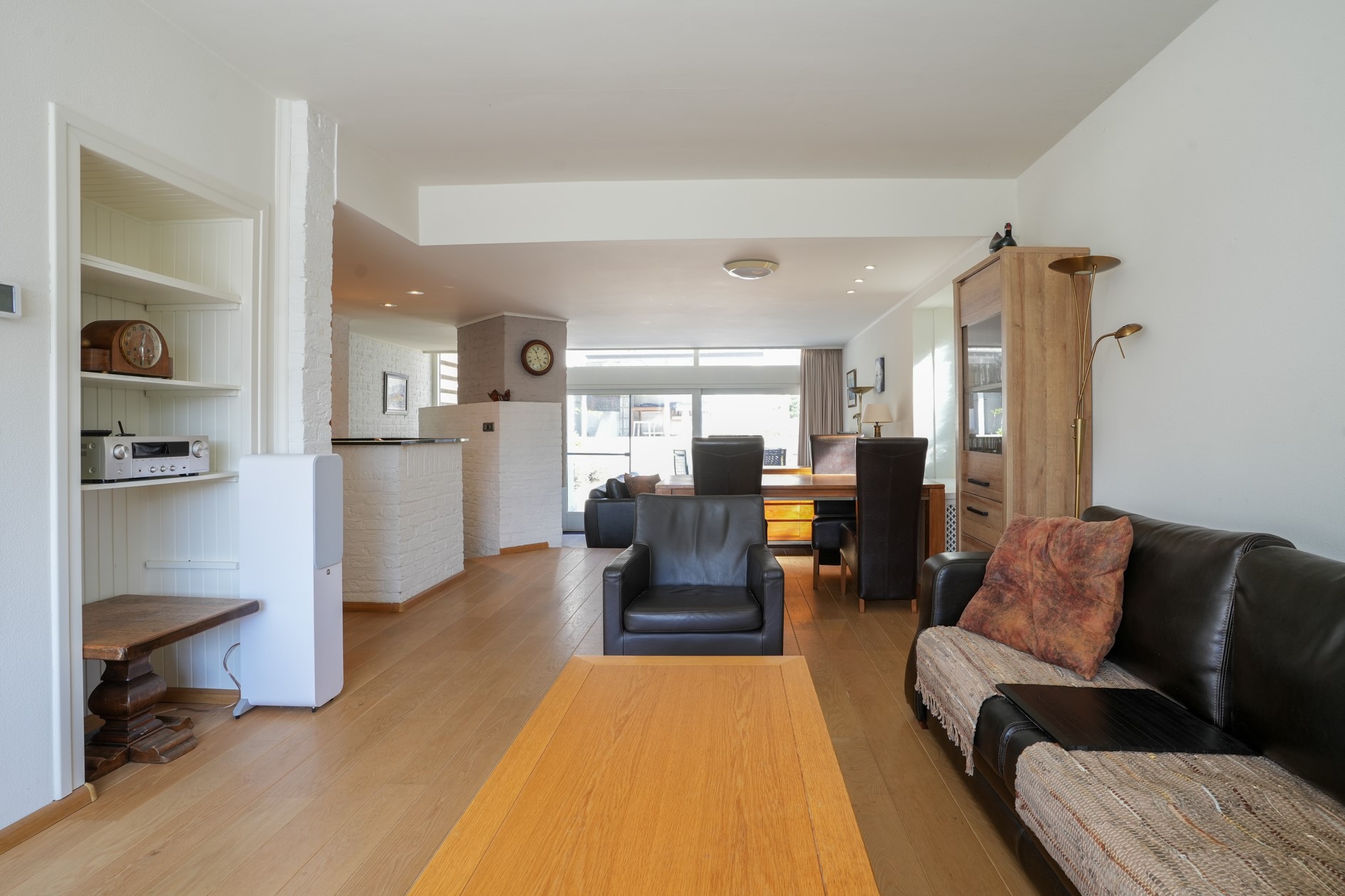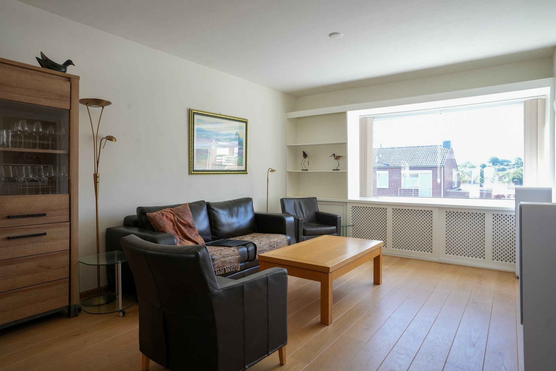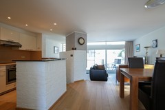 Woon- en eetkamer voorzien van parketvloer, met balkon aan voorzijde