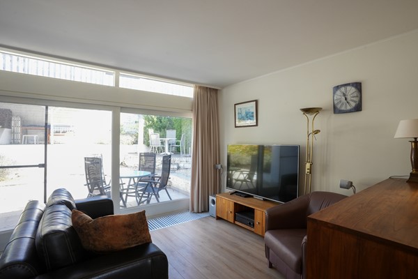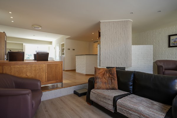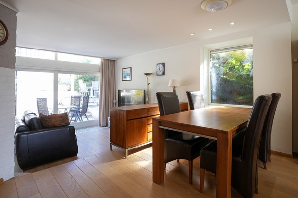 Zitkamer voorzien van parketvloer, met gashaard, trap naar wijnkelder en schuifpui naar de tuin