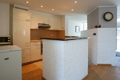 Open keuken voorzien van de volgende inbouwapparatuur; keramische kookplaat, oven, koelkast, vaatwasser en afzuigkap