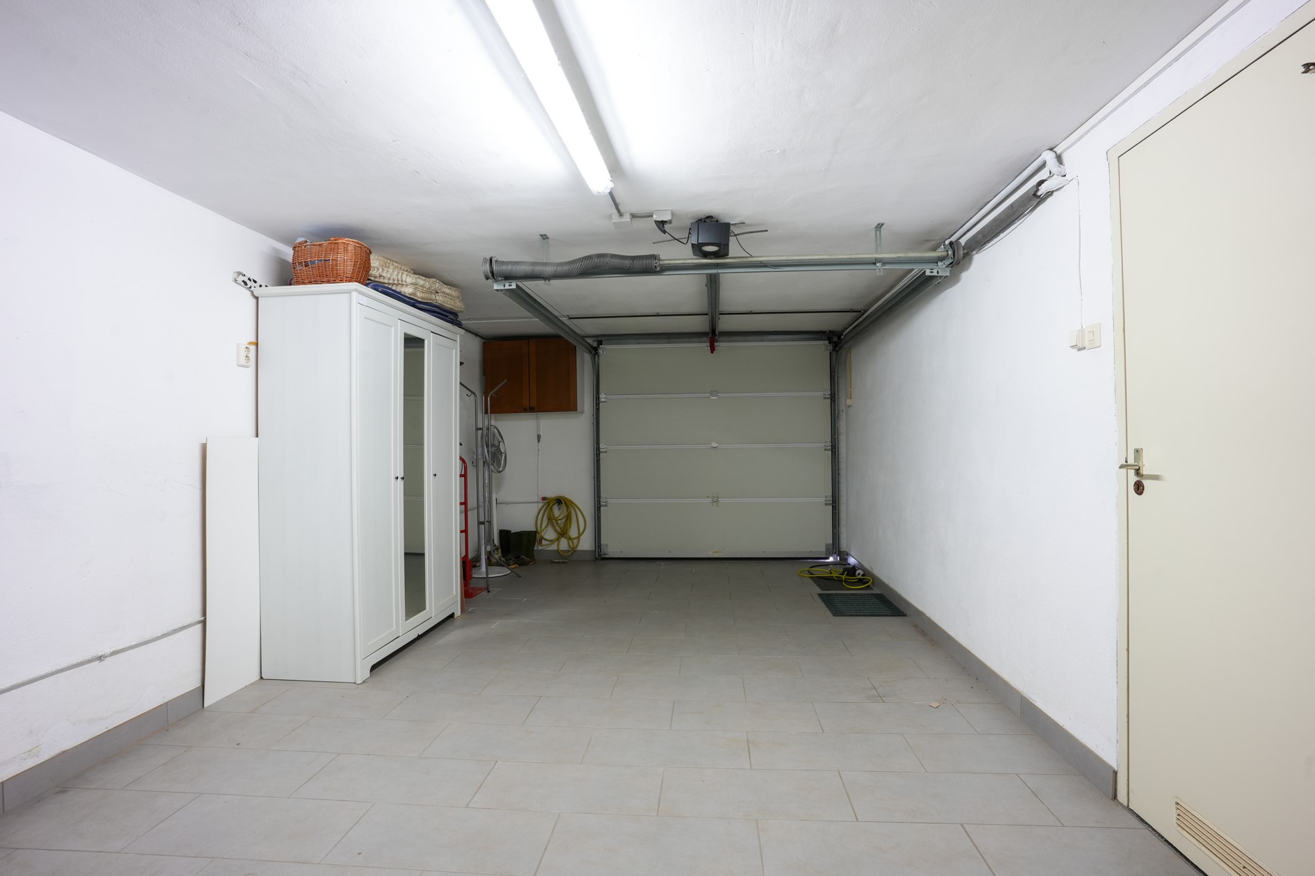Garage voorzien van tegelvloer, met automatische sectionaalpoort