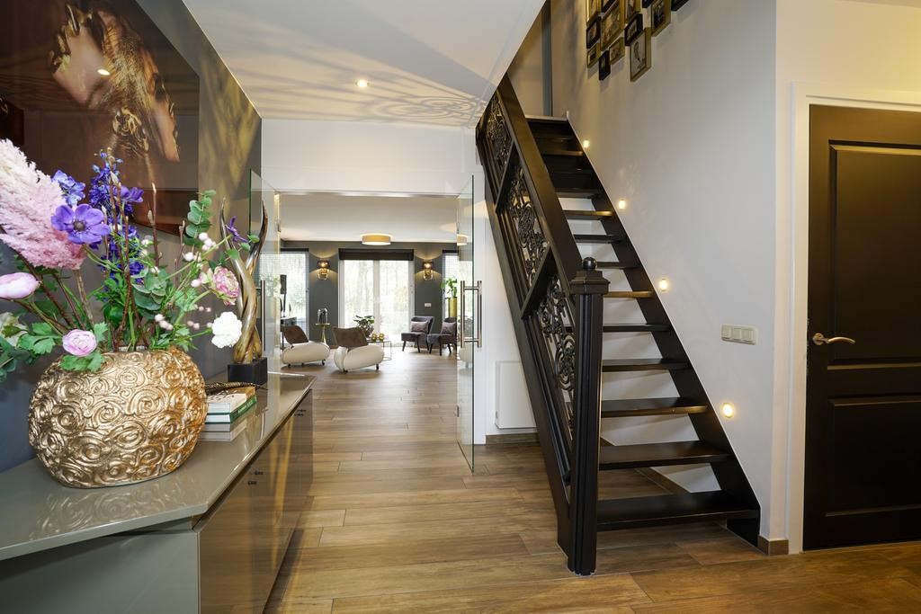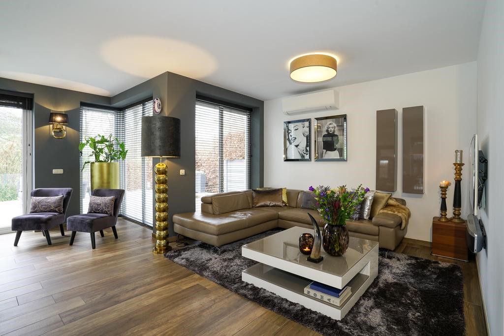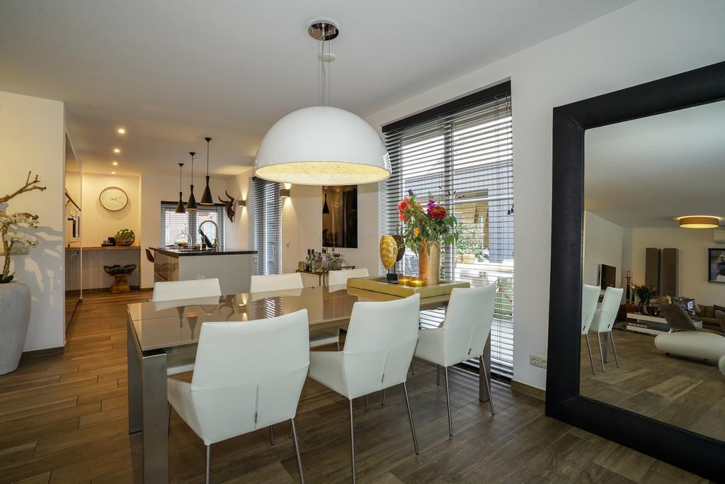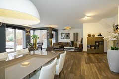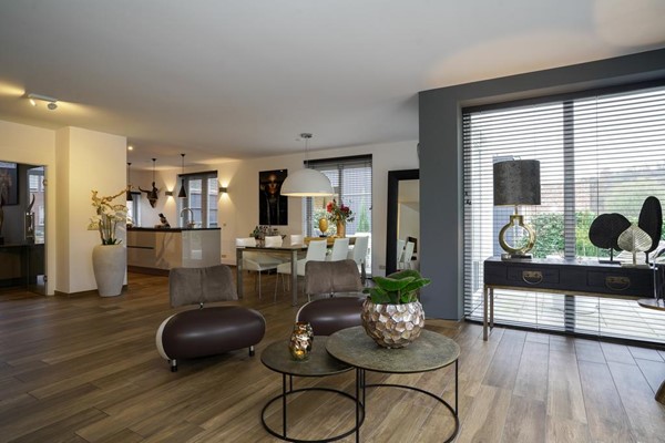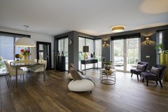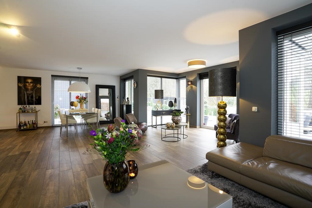 De leefruimtes begane grond zijn voorzien van een doorlopende houtlook plavuizenvloer met vloerverwarming
