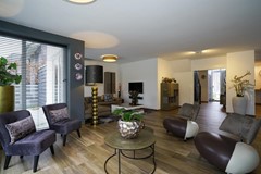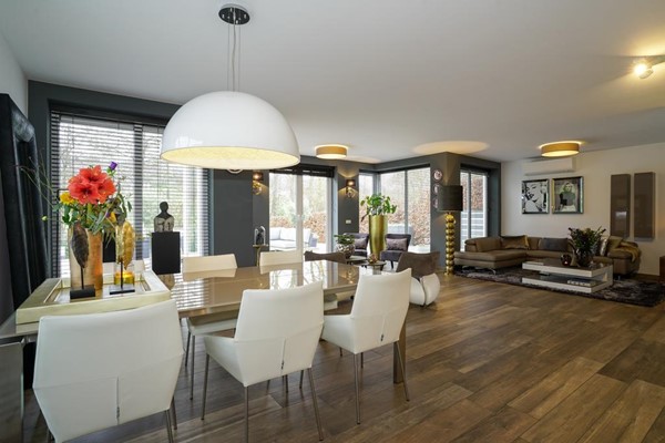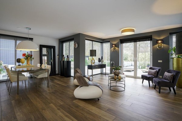 Woonkamer voorzien van erker met dubbel openslaande tuindeuren, zitgedeelte, eetgedeelte en televisiehoek