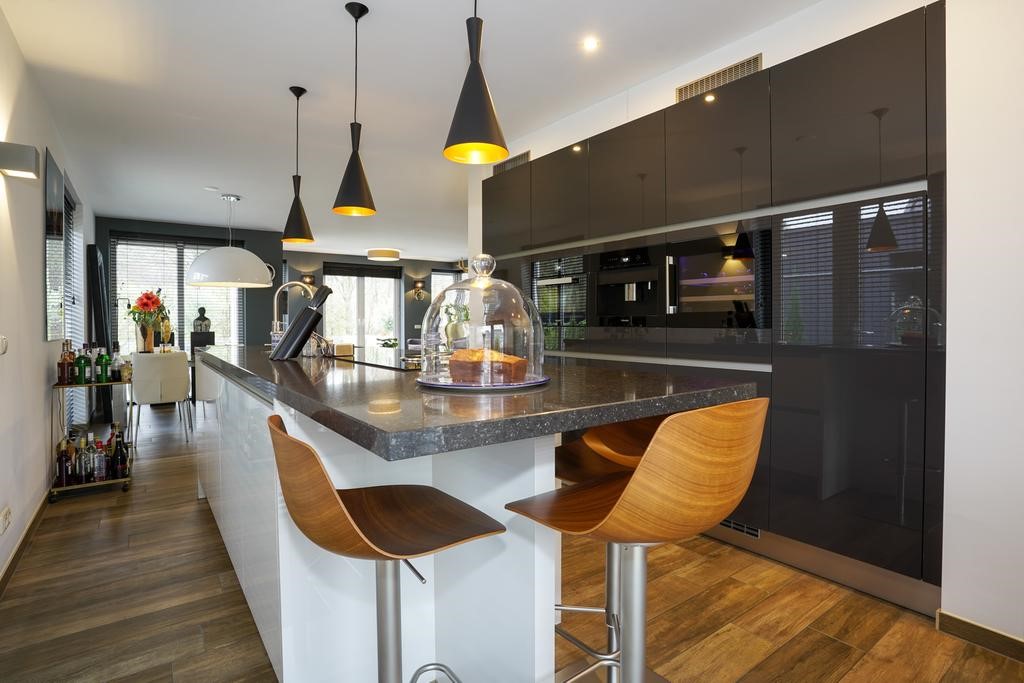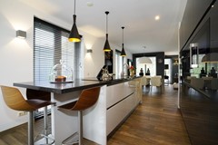 Open keuken voorzien van luxe aanbouwinstallatie met kastenwand en kookeiland met bargedeelte, de volgende apparatuur is aanwezig: Bora inductiekookplaat met ingebouwde afzuiging, combi stoomoven, koffieautomaat, wijnklimaatkoelkast, vaatwasser, Quooker kokend waterkraan en koelkast