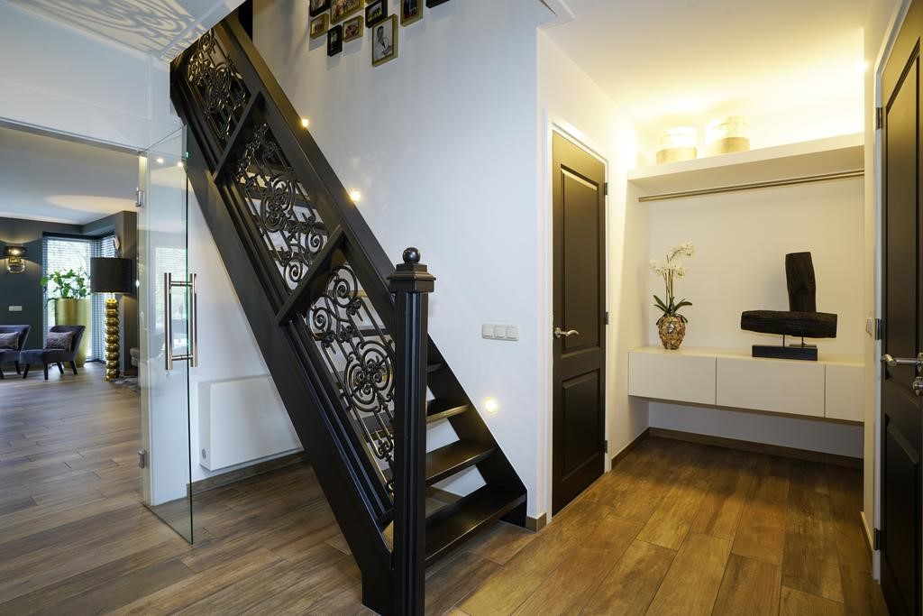 Entree, hal met maatwerk garderobekast, meterkast en trapopgang