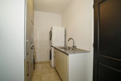Wasruimte met aanrechtblok voorzien van extra oven en magnetron en witgoedaansluiting, afgewerkt met tegelvloer