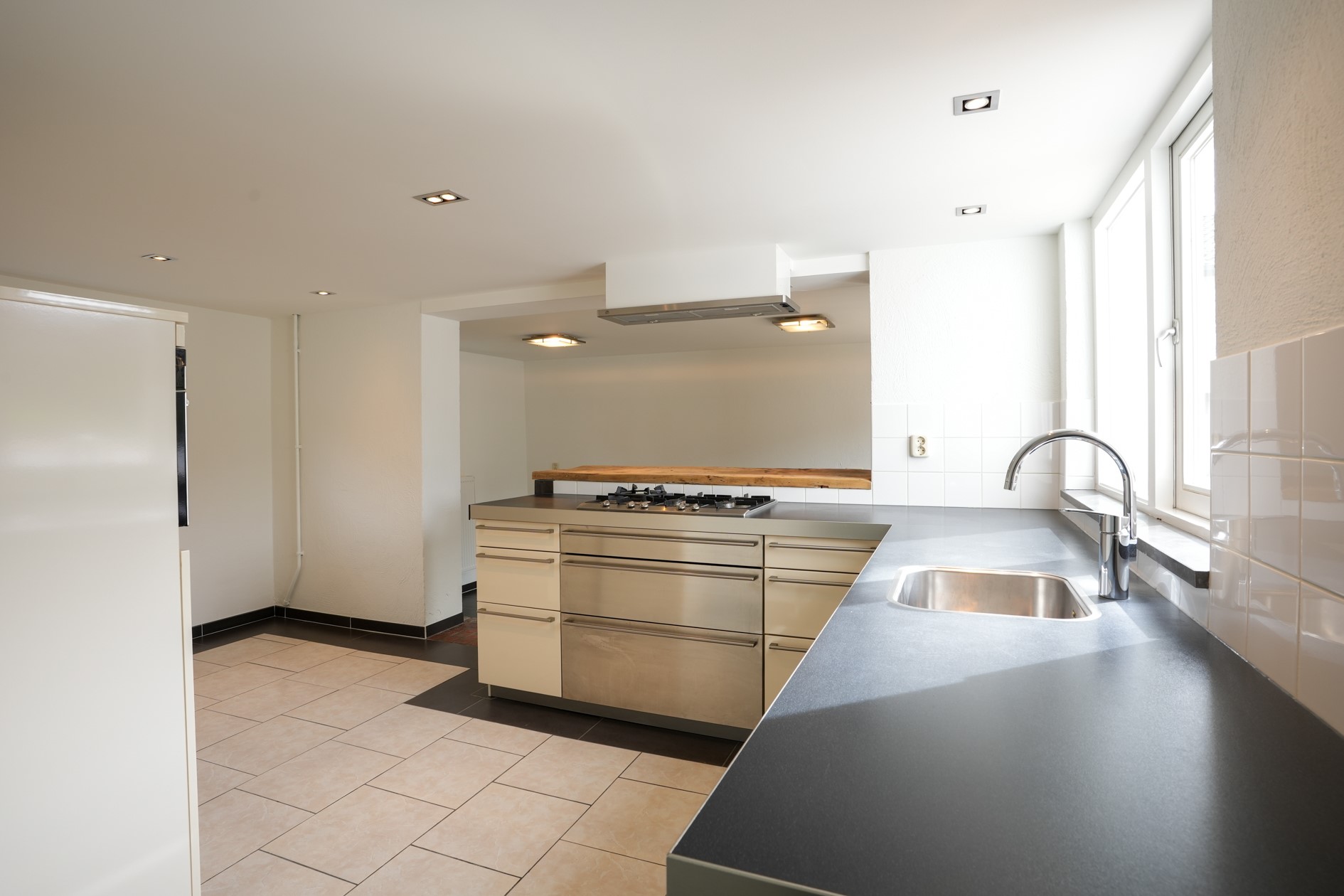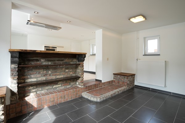 Woonkeuken voorzien van eetkamer met plavuizen vloer, keukengedeelte met aanbouwinstallatie voorzien van 5 pits gaskookplaat, afzuigkap, vaatwasser, combi oven en koelkast. CV hok