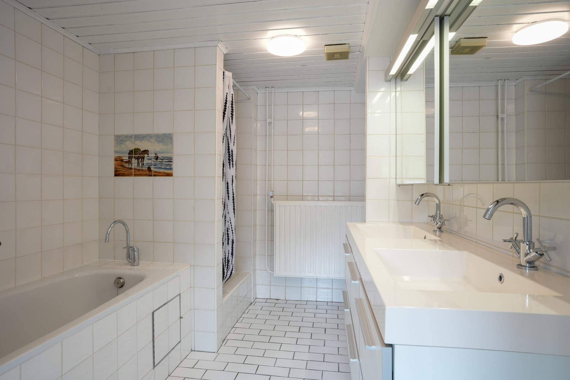 Badkamer voorzien van ligbad, douche, dubbel wastafelmeubel en staand closet