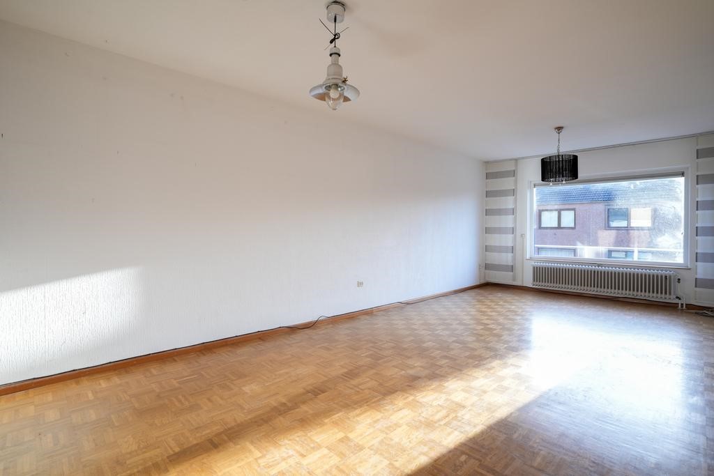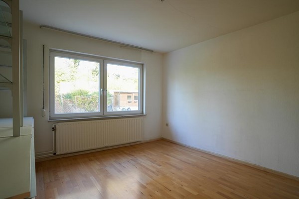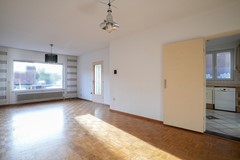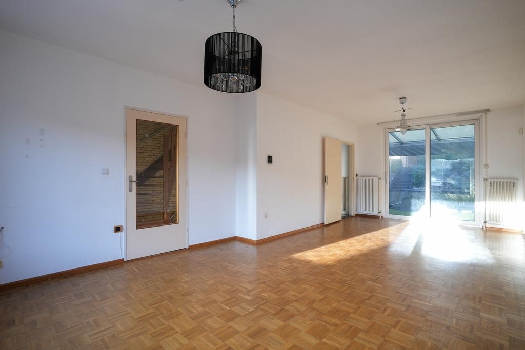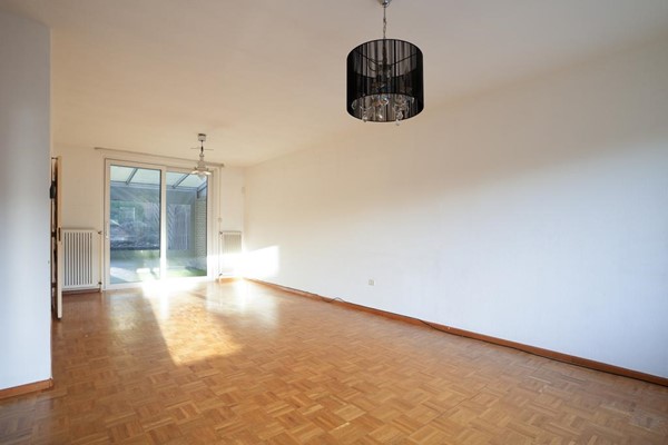 Woonkamer voorzien van mozaïek parketvloer en schuifpui naar tuin
