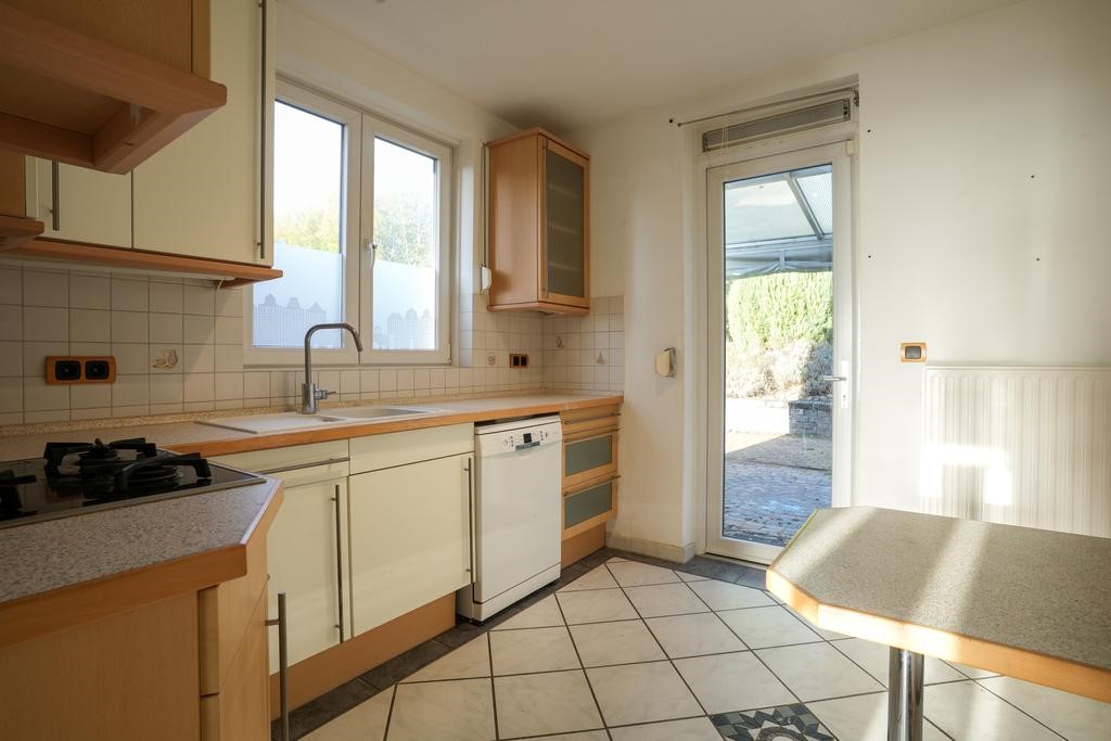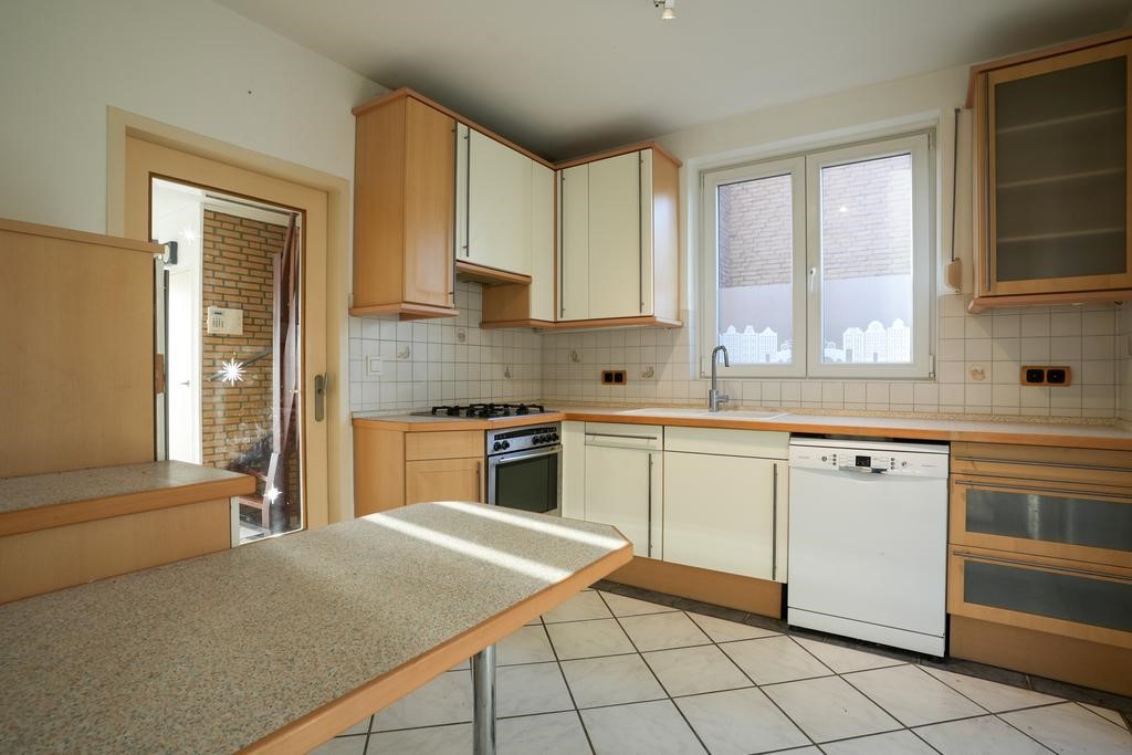 Gesloten keuken voorzien van tegelvloer, aanbouwinstallatie met de volgende apparatuur: oven, gaskookplaat, afzuigkap, koelkast, vaatwasser