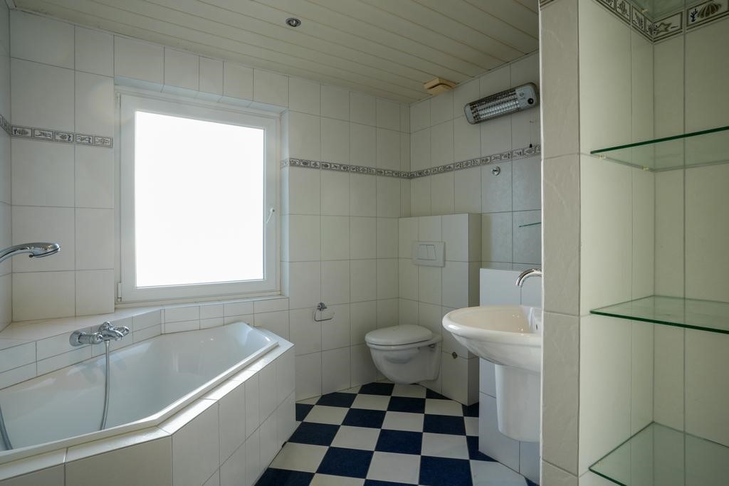 Badkamer voorzien van ligbad, hangend toilet, wastafel en inloopdouche